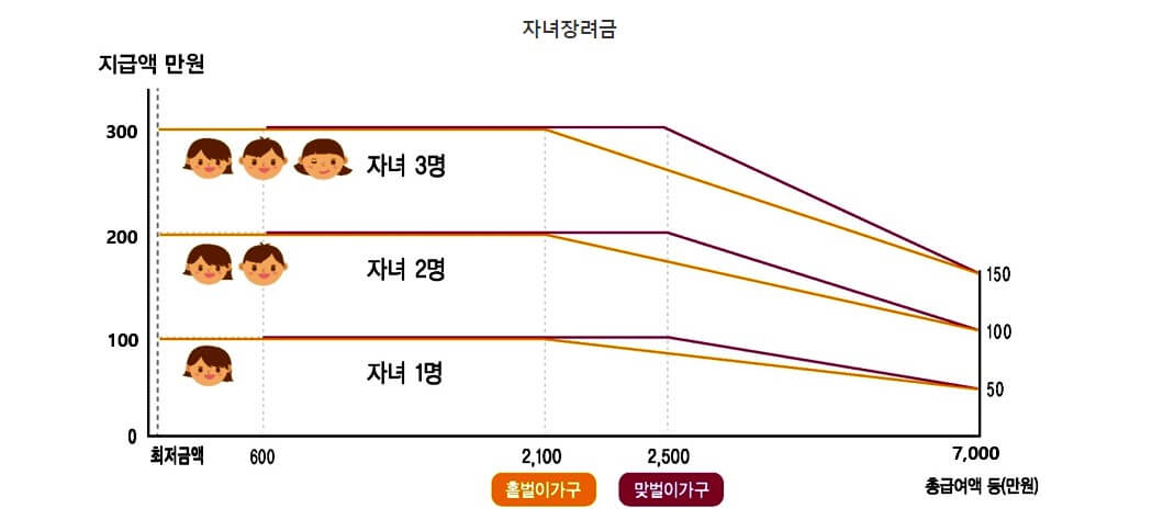 | 최대지급액 | 자녀 1인당 최대 100만원 / 최소 50만원 | ||