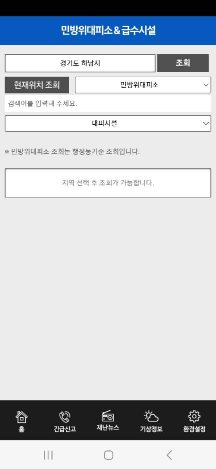 2. 메인화면에 [대피소 조회]를 클릭하고, 주소로 검색할 수도 있지만, 현재위치 조회로 바로 확인도 가능합니다.