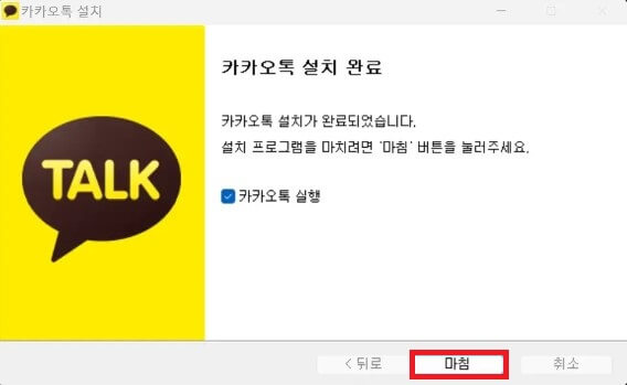 8. 설치완료 메세지가 뜹니다. [다음] 버튼을 클릭하여 카카오톡을 실행합니다.