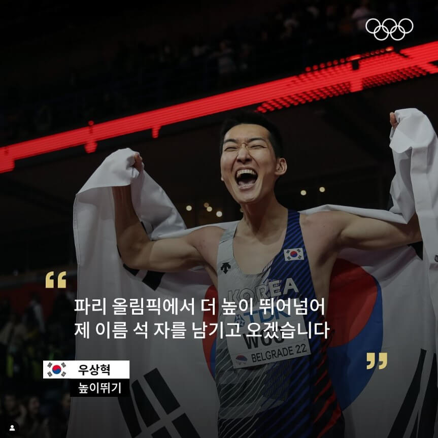 우상혁은 2020 도쿄에서 아쉽게 4위에 그쳤습니다. 이번 파리 올림픽에서는 쟁쟁한 경쟁자들을 제치고 시상대에 오를 수 있을지 그의 도약이 기대됩니다. 한국 육상은 마라톤에서 금메달 1개와 은메달 1개를 획득한 바 있습니다.